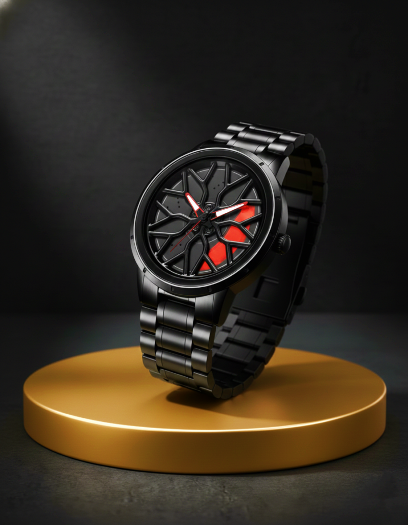Our Wheel Watch is a stylish timepiece inspired by automotive wheel rims. With a bold dial, durable build, and modern design, it adds a strong statement to your style. Comfortable for daily wear and perfect for gifting, it’s not just a watch — it’s a reflection of personality and passion.